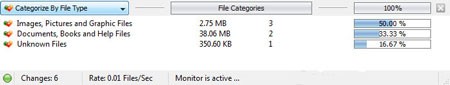 Khung phía dưới cung cấp thống kê về số lượng file trong thư mục, được phân loại theo định dạng. Đồng thời, nó hiển thị dung lượng của từng định dạng và tỷ lệ phần trăm dung lượng đó so với tổng dung lượng thư mục. Bạn có thể thay đổi cách phân loại bằng cách nhấp vào khung Categorize By Extension và chọn một trong các tùy chọn sau: Categorize By Change Types (file có thay đổi), Categorize By User Name (theo người tạo file), Categorize By File Size (theo dung lượng file), Categorize By File Type (theo loại file, như hình ảnh, tài liệu,…).