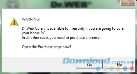 Sau khi nhấn Cancel để kích hoạt chế độ hoạt động thông thường, một hộp thoại sẽ xuất hiện, hỏi người dùng có muốn mua bản quyền phần mềm hay không. Thực tế, Dr.Web CureIt miễn phí đối với người dùng cá nhân và chỉ yêu cầu người dùng doanh nghiệp mua bản quyền để sử dụng.