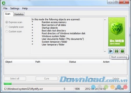 Theo mặc định, phần mềm sẽ quét ở chế độ “Express Scan”, là chế độ quét nhanh, tập trung vào các thành phần quan trọng như file hệ thống và các file khởi động của hệ thống. Đây là những khu vực dễ bị virus tấn công và gây ra hậu quả nghiêm trọng.