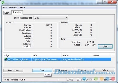 Sau khi quá trình quét hoàn tất, danh sách các file bị lây nhiễm và nghi ngờ sẽ được phần mềm liệt kê. Bạn có thể chọn tác vụ phù hợp cho từng file, chẳng hạn như nhấn “Cure” để phần mềm cố gắng làm sạch file (loại bỏ virus khỏi file) hoặc chọn “Delete” để xóa hoàn toàn file bị lây nhiễm.