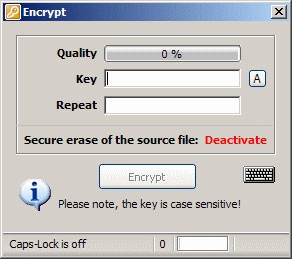 Chỉ cần kéo và thả file hoặc thư mục bạn muốn mã hóa vào biểu tượng này. Sau đó, nhập mật khẩu vào hai ô Key và Repeat, rồi nhấn vào nút Encrypt.
