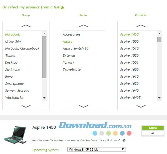 Chọn Notebook-, sau đó chọn Aspire và cuối cùng là Aspire 1450.