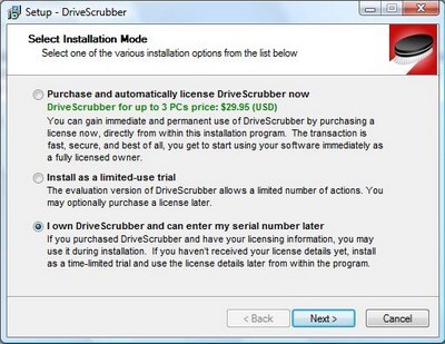 - Tại bước thứ 3 của quá trình cài đặt, khi xuất hiện hộp thoại, bạn chọn tùy chọn ‘I own DriveScrubber and can enter my serial number later’ rồi nhấn Next để tiếp tục.