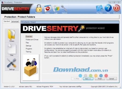 Đối với người dùng mới, "Run Protection Wizard" là lựa chọn tốt nhất, vì nó sẽ hướng dẫn bạn từng bước để cấu hình các quy tắc bảo vệ phù hợp. Sau khi hoàn thành các bước này, bạn đã có tài khoản và có thể đăng nhập vào DriveSentry.