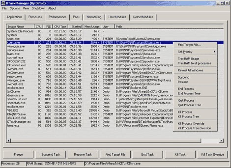 - Thẻ Processes: Cung cấp thông tin về các process hiện hành. Khi nhấp chuột phải vào một process, menu ngữ cảnh sẽ mở ra, cho phép truy xuất đến vị trí lưu trữ tập tin thực thi (Find Target File), thiết lập mức độ ưu tiên xử lý (Set Priority), giảm dung lượng bộ nhớ RAM đang sử dụng (Trim RAM Usage/Trim RAM to all processes), tạm dừng (Suspend) hoặc khôi phục process (Resume).