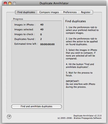 Điểm nổi bật của chương trình là sự đơn giản, tính gọn nhẹ và giao diện trực quan, dễ sử dụng. Duplicate Annihilator ứng dụng các thuật toán tìm kiếm tiên tiến, cho phép người dùng nhanh chóng xác định và chọn lọc những ảnh trùng lặp trong thư viện iPhoto.
