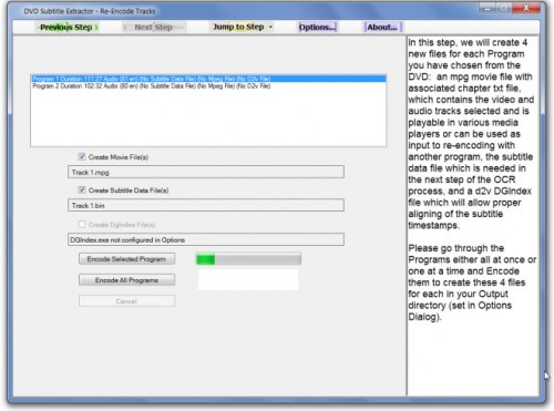 Đây là giai đoạn cuối cùng của quá trình trích xuất. Nhấn nút Encode All để bắt đầu. Ứng dụng sẽ tạo ra hai tập tin: một tập tin video và một tập tin phụ đề (.bin).