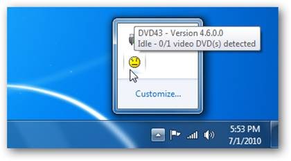 Ngay sau khi khởi động, ứng dụng sẽ hoạt động ẩn trên khay hệ thống, biểu tượng DVD43 ban đầu có màu vàng, thể hiện trạng thái chờ.