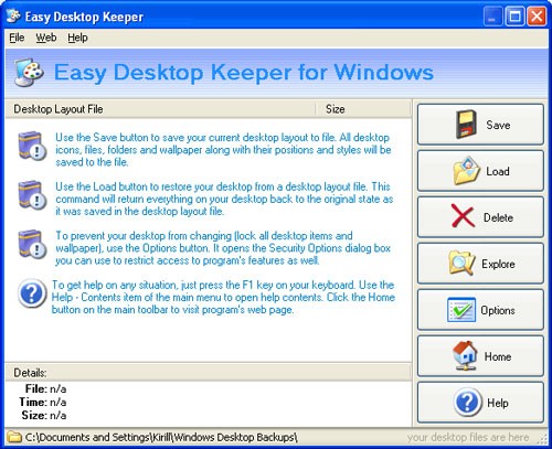 Easy Desktop Keeper 3.02 cung cấp một giải pháp mạnh mẽ để lưu trữ, phục hồi, quản lý và khóa Desktop, bao gồm cả các tập tin và thư mục, biểu tượng, hình nền và trình bảo vệ màn hình.