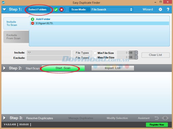 Tiếp theo, hãy nhấp vào tùy chọn Select Folders để chỉ định thư mục mà bạn muốn quét tìm file trùng lặp. Sau đó, nhấn Start Scan để bắt đầu quá trình quét thư mục đã chọn. Ngoài ra, bạn cũng có thể đơn giản hóa thao tác bằng cách kéo và thả trực tiếp thư mục vào cửa sổ chương trình.