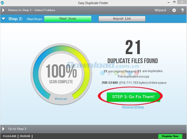 Khi quá trình quét thư mục kết thúc, số lượng các file trùng lặp được tìm thấy sẽ được hiển thị trên giao diện. Để tiến hành xử lý các file này, bạn hãy nhấn vào Go Fix Them.