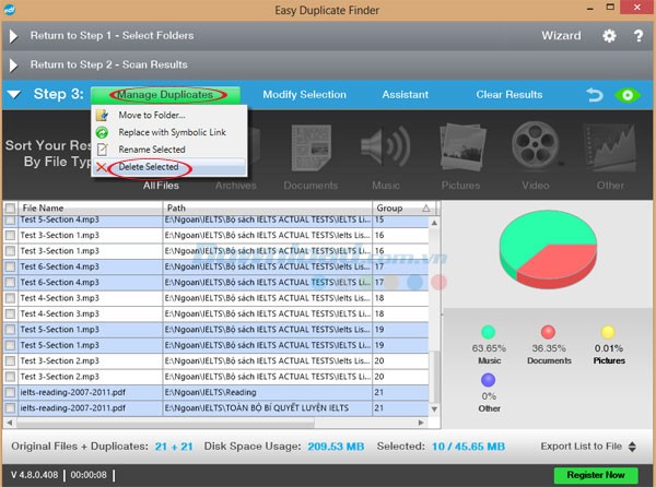 Tiếp theo, nhấp vào nút Manage Duplicates và chọn Delete Selected để xóa các file trùng lặp mà bạn đã chọn.