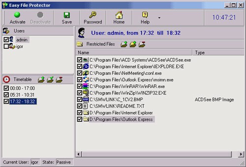 Easy File & Folder Protector sở hữu giao diện trực quan, dễ sử dụng, cho phép bạn phân quyền truy cập đối với các file và folder cho nhiều người dùng khác nhau. Quyền hạn này có thể được thiết lập dựa trên lịch trình thời gian cụ thể.
