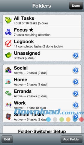 Ứng dụng hỗ trợ các thư mục tùy chỉnh, giúp người dùng sắp xếp công việc theo nhu cầu cá nhân (ví dụ: công việc văn phòng, việc nhà, các công việc vặt...). Số lượng thư mục không giới hạn và có thể tùy chỉnh tên, biểu tượng, hộp đánh dấu.