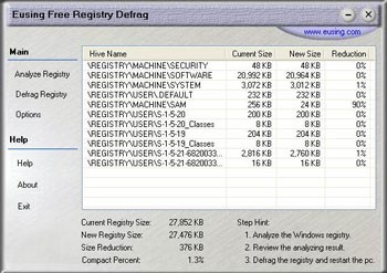 Eusing Free Registry Defrag là một giải pháp hiệu quả, có khả năng chống phân mảnh và nén registry của Windows chỉ trong một phút. Phần mềm này sẽ tiến hành quét toàn bộ registry để giảm kích thước và lượng RAM mà registry chiếm dụng, qua đó cải thiện đáng kể hiệu suất máy tính.