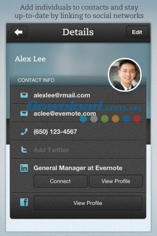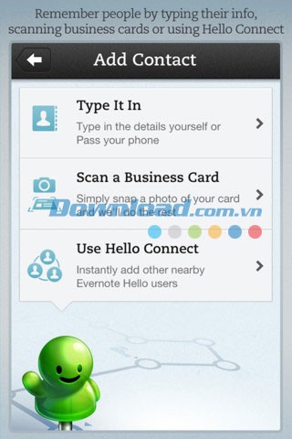 Tạo Hello Contacts một cách nhanh chóng bằng tính năng quét danh thiếp mới. Chụp ảnh danh thiếp của một người bằng Evernote Hello, và các thông tin quan trọng như tên, số điện thoại, địa chỉ email sẽ được tự động nhận diện và lưu trữ.