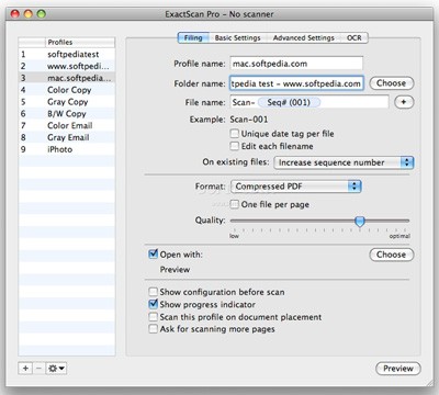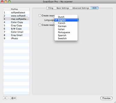 - ExactScan hỗ trợ nhiều định dạng file văn bản phổ biến, bao gồm PDF, Compressed PDF, JPEG, JPEG2000, (multi-page-) TIFF, PNG, bộ công cụ Microsoft Office và các phần mềm DEVONthink.