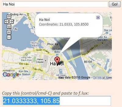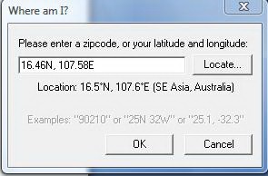 Bạn có thể tìm thông tin về tọa độ tại http://stereopsis.com/flux/map.html . Chỉ cần nhập tên thành phố và nhấn nút Go!, tọa độ sẽ được hiển thị ở khung bên dưới. Sao chép tọa độ này và dán vào hộp thoại Where am I?.
