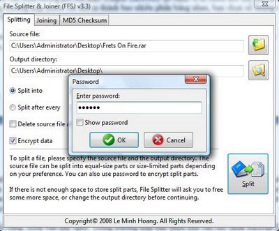 Nhấp vào nút Split. Trong trường hợp đã chọn tùy chọn Encrypt Data, một hộp thoại sẽ xuất hiện yêu cầu nhập mật khẩu.