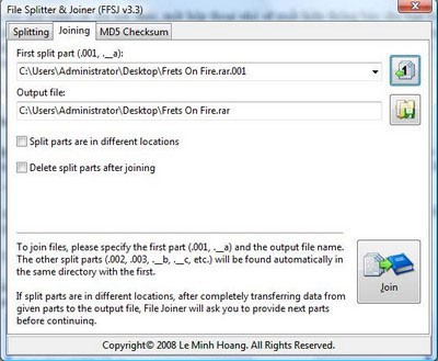 - Joinning: Chọn phần đầu tiên của các phần đã chia, thư mục lưu trữ file sau khi nối, và tùy chọn nối các phần từ các vị trí khác nhau hoặc xóa các phần sau khi nối.