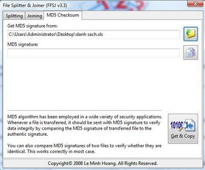 Ngoài hai tính năng chính là cắt và ghép file, FFSJ còn cung cấp chức năng kiểm tra mã MD5 để đảm bảo tính toàn vẹn của file và xác minh dữ liệu không bị thay đổi so với file gốc. Tính năng này đặc biệt hữu ích khi chia sẻ các file có dung lượng lớn hoặc chứa dữ liệu quan trọng.
