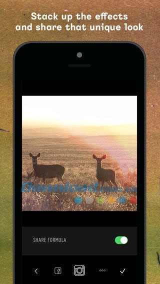 Sau khi hoàn tất quá trình chỉnh sửa, sử dụng một hiệu ứng đơn lẻ hoặc kết hợp nhiều bộ lọc, người dùng có thể chia sẻ ảnh ngay lập tức. Bạn có thể chọn tùy chọn Share Formula hoặc sử dụng các chức năng chia sẻ khác. Chia sẻ ảnh lên các mạng xã hội như Facebook, Instagram, Twitter hoặc gửi qua email dưới dạng tệp đính kèm.