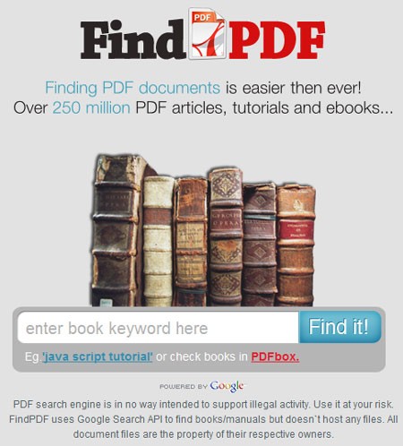 FindPDF.net tận dụng sức mạnh của Google Search API để truy xuất thông tin sách. Tốc độ tìm kiếm của trang web khá nhanh chóng, đồng thời sở hữu giao diện trực quan, thân thiện với người dùng. Toàn bộ kết quả tìm kiếm đều được lấy từ Google.