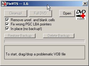 FixVTS là một tiện ích hỗ trợ điều chỉnh các tập tin trên đĩa DVD, giúp đảm bảo tính tương thích và cho phép mở chúng trong các phần mềm như DVDShrink hoặc VobBlanker.