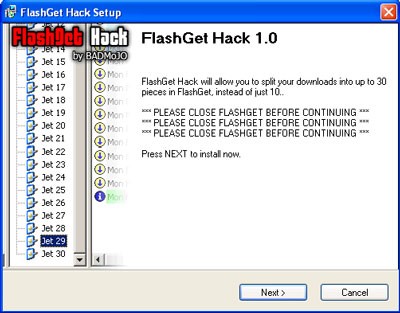 FlashGet Hack là một tiện ích nhỏ được thiết kế để mở rộng giới hạn này, cho phép FlashGet chia một tập tin thành tối đa 30 phần, qua đó nâng cao đáng kể tốc độ tải xuống.