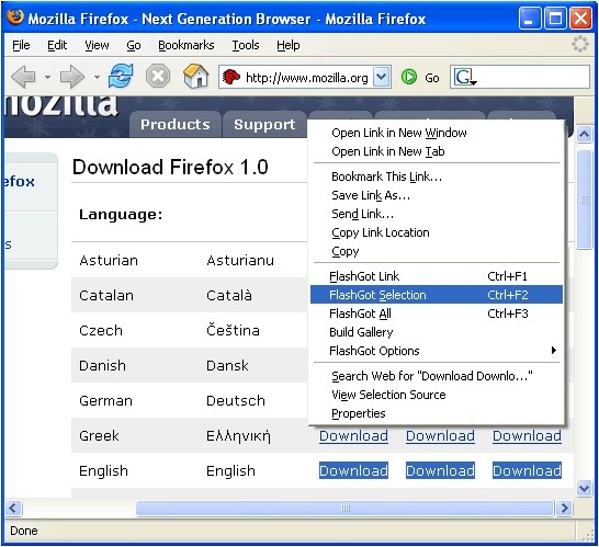 FlashGot là một tiện ích mở rộng giúp kích hoạt việc tải xuống bằng cách sử dụng các trình quản lý tải bên ngoài phổ biến như Internet Download Accelerator, Internet Download Manager, FlashGet.