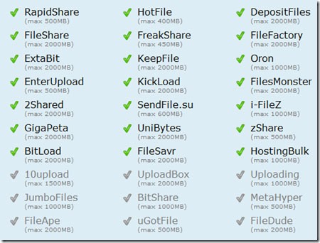 Danh sách các dịch vụ chia sẻ được hỗ trợ sẽ hiển thị ngay bên dưới trang. Chọn dịch vụ bạn muốn sử dụng bằng cách nhấp vào tên của nó; khi tên website được đánh dấu bằng dấu tick màu xanh, điều đó có nghĩa là bạn đã chọn sử dụng dịch vụ đó. Dung lượng file tối đa được phép chia sẻ trên mỗi nền tảng cũng được liệt kê rõ ràng.