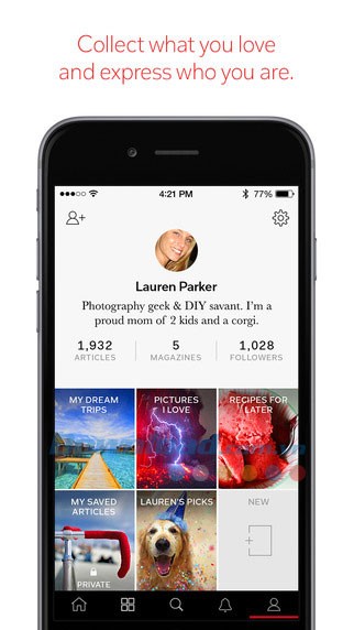 Lưu những câu chuyện, hình ảnh và video yêu thích từ web. Sau đó tạo tạp chí đẹp mắt từ các chủ đề quen thuộc, chẳng hạn như thiết kế giữa thế kỷ, nghệ thuật ẩm thực Ý cho tới những sản phẩm công nghệ đang được yêu thích.