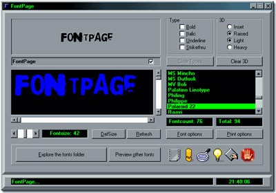 FontPage là một tiện ích giúp bạn quản lý các phông chữ trên máy tính. Chức năng chính của nó là liệt kê danh sách các phông chữ có sẵn và cho phép xem trước kiểu chữ cùng các thuộc tính như in đậm, in nghiêng, gạch dưới, gạch ngang, và hiệu ứng 3D.