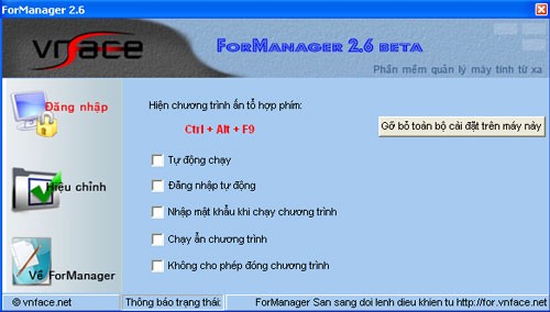 Bước 1: Đăng ký tài khoản trên http://for.vnface.net. Bước 2: Tải phần mềm. Bước 3: Chạy ForManager 2.6 beta và đăng nhập bằng tài khoản đã tạo trên http://for.vnface.net. Bước 4: Đăng nhập vào http://for.vnface.net để điều khiển các máy tính đã cài đặt.