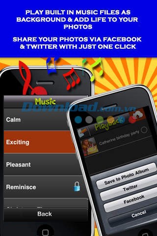Trong mục Playback, bạn có thể xem lại video nhạc đã tạo. Nhấn Play để xem video ảnh, xóa, lưu lại hoặc chia sẻ lên Twitter và Facebook. Để xóa, vuốt lên slide show nhạc bạn muốn xóa và nhấn nút Delete để xóa vĩnh viễn khỏi FotoSlides Lite. Để chia sẻ, nhấn nút Upload, chọn video muốn tải lên và chia sẻ hoặc lưu vào thư mục Photos. Với FotoSlides Lite, bạn có thể dễ dàng chia sẻ những video chất lượng cao, ấn tượng với bạn bè và người thân mọi lúc, mọi nơi.