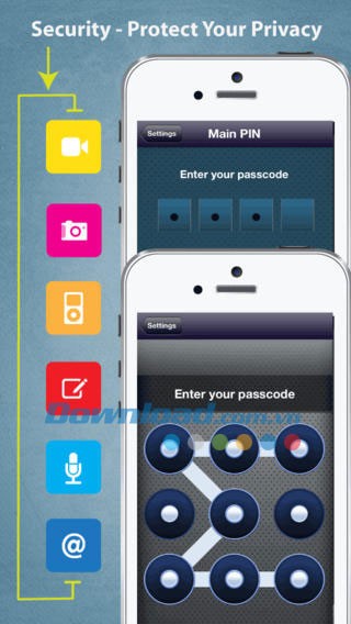- Ứng dụng cung cấp khả năng bảo vệ dữ liệu bằng mã khóa, áp dụng cho ảnh, video, tài liệu, danh bạ và album audio.