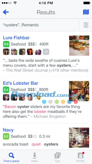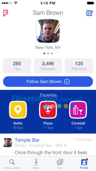 - Theo dõi những người dùng và những người liên quan mà bạn tin tưởng để xem gợi ý của họ đầu tiên. Kết nối tài khoản Facebook và Twitter để xem những địa điểm bạn bè yêu thích.