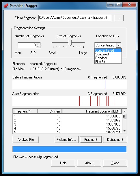 Người dùng có thể kiểm soát số lượng và kích thước của các phân mảnh, cũng như vị trí của chúng trên ổ đĩa. Điểm đặc biệt là Fragger có thể phân mảnh các file hiện có mà không yêu cầu thêm không gian trống.