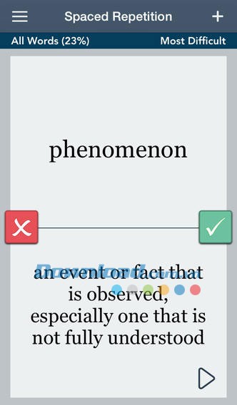 Khi bạn học từ vựng trong chế độ Spaced Repetition, mức độ khó sẽ chuyển từ khó nhất đến khó, trung bình đến dễ và dễ nhất.
