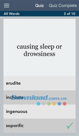 Chế độ Quiz Mode sẽ kiểm tra khả năng ghi nhớ từ vựng của bạn bằng cách hiển thị một từ bất kỳ ở phía trên màn hình và một vài phương án lựa chọn ở bên dưới.