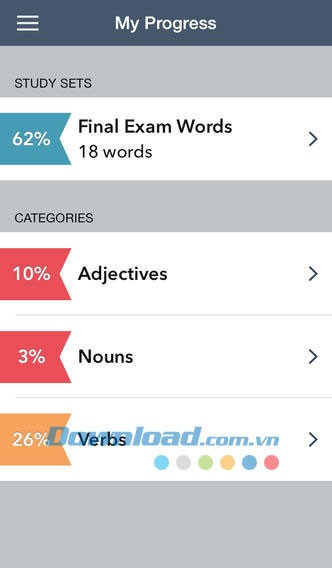 Người dùng có thể theo dõi sự tiến bộ của mình trong từng danh mục hoặc bộ học tập cụ thể. Từ vựng sẽ được xếp hạng theo mức độ khó, từ khó nhất đến dễ nhất.