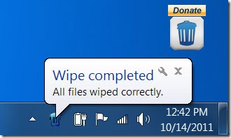 Free File Wiper thực hiện xóa file với tốc độ nhanh chóng và đảm bảo dữ liệu đã xóa không thể khôi phục. Do đó, cần thận trọng khi sử dụng phần mềm này. Một thông báo nhỏ sẽ xuất hiện tại khay hệ thống khi quá trình xóa hoàn tất.