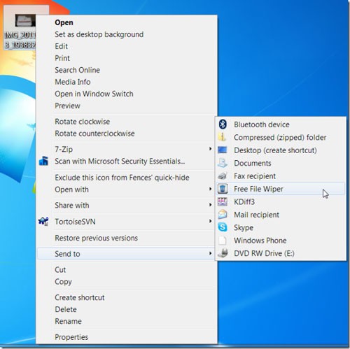 Bên cạnh đó, Free File Wiper còn tích hợp khả năng xóa file trực tiếp từ menu ngữ cảnh (menu chuột phải). Bạn chỉ cần nhấp chuột phải vào file hoặc thư mục mong muốn và chọn Send To -> Free File Wiper.