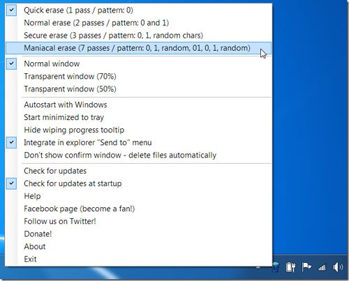 Theo thiết lập mặc định, Free File Wiper xóa file bằng cách ghi đè dữ liệu lên vị trí lưu trữ ban đầu của file một lần. Để tăng cường mức độ bảo mật, bạn có thể tùy chọn ghi đè dữ liệu nhiều lần hơn, lên đến tối đa bảy lần. Các tùy chọn này có thể được cấu hình bằng cách nhấp chuột phải vào biểu tượng chương trình ở khay hệ thống. Ngoài ra, bạn cũng có thể tùy chỉnh các chức năng khác như khởi động cùng Windows, điều chỉnh độ trong suốt của chương trình,...