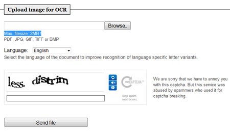 Nhập mã xác nhận bên dưới và nhấn nút Send File để bắt đầu quá trình tải lên và nhận dạng văn bản.