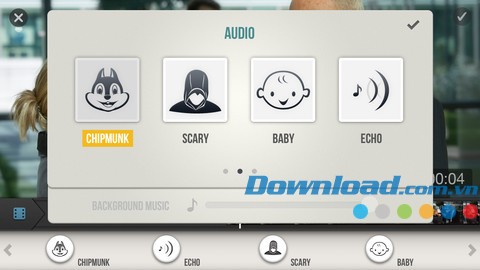Bạn có thể biến đổi giọng nói thành nhiều giọng điệu khác nhau, như giọng sóc chuột, giọng sợ hãi, giọng trẻ con, hoặc thêm một bản nhạc nền tùy chọn từ thư viện nhạc của thiết bị. Việc kết hợp nhạc từ iPod với âm thanh gốc cũng được hỗ trợ trong quá trình quay hoặc chỉnh sửa video.
