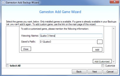 Trong cửa sổ này, chọn Add Customized để thêm các trò chơi không tự động hiển thị trong Gameton Add Game Wizard. Sau đó, nhập tên trò chơi vào ô Viewing Name và chỉ định đường dẫn lưu trữ vào ô Save’s Path.