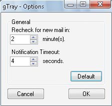 - Làm cách nào thiết lập thời gian tự động kiểm tra email mới trong gTray? Nhấp chuột phải vào biểu tượng gTray, chọn Options để thiết lập khoảng thời gian kiểm tra email tự động.