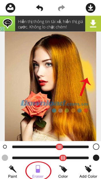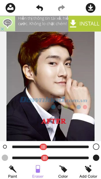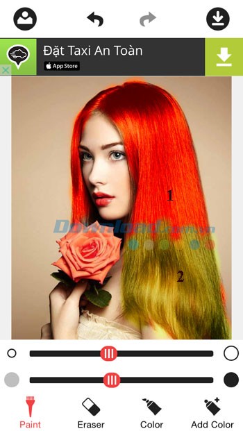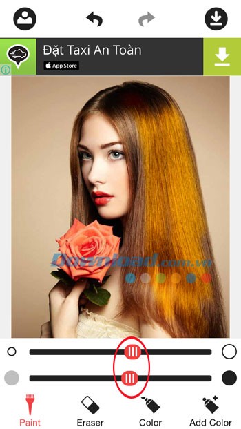 Sau khi chọn màu tóc mong muốn từ mục Color, sử dụng công cụ Paint để nhuộm một phần hoặc toàn bộ mái tóc tùy theo sở thích cá nhân. Bạn có thể điều chỉnh cường độ màu và kích thước đầu chổi nhuộm tóc, đầu tẩy bằng thanh trượt tiện lợi trong ứng dụng.