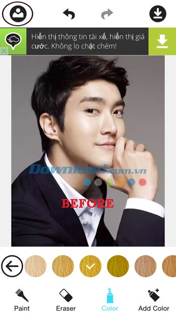 Hair Color Dye là một ứng dụng nhuộm tóc ảo vô cùng thân thiện với người dùng. Giao diện chính được chia thành 4 phần: Paint (dùng để nhuộm tóc), Eraser (dùng để tẩy màu), Color (chọn màu sắc) và Add Color (thêm màu thứ hai).